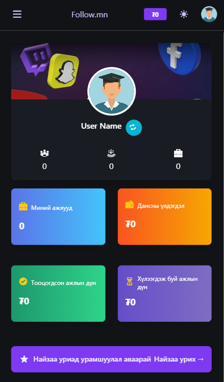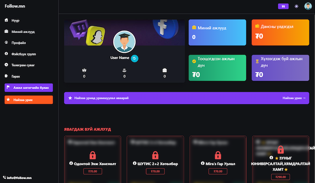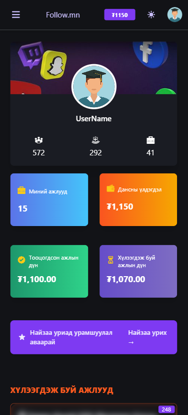 Follow.mn нь гэртээ ажил хийх боломжгүй эсвэл үндсэн ажлаасаа өөр нэмэлт орлого олох хүсэлтэй хүмүүст зориулан бүтээж буй платформ юм.