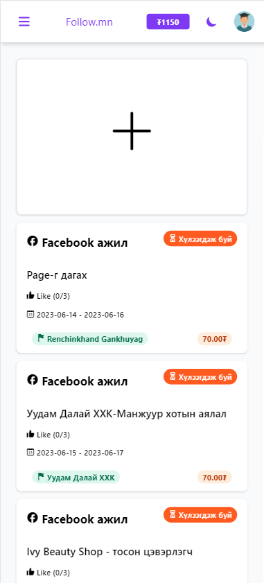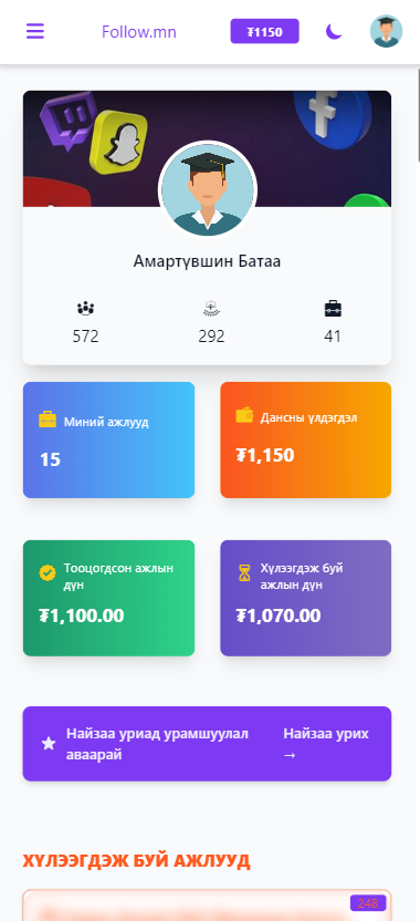 Follow.mn нь гэртээ ажил хийх боломжгүй эсвэл үндсэн ажлаасаа өөр нэмэлт орлого олох хүсэлтэй хүмүүст зориулан бүтээж буй платформ юм.